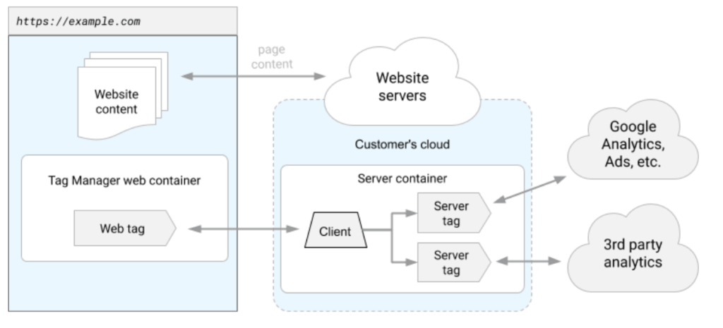 Il tracciamento server-side rappresenta una vera e propria rivoluzione nel modo in cui vengono gestiti i dati degli utenti. A differenza del tracciamento client-side, dove è il browser dell’utente a inviare i dati direttamente ai fornitori di servizi (es. Meta, Google Ads, TikTok, ecc.), nel server-side il flusso viene completamente centralizzato e gestito da un server cloud configurato e controllato dall’azienda.